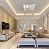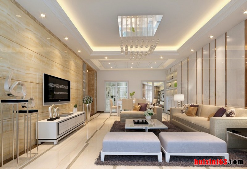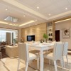 凹位造型石膏客厅吊顶,简约且富有层次感,水晶珠帘吸顶灯安装在客厅吊顶中央,为吊顶增色不少,暖色调灯带搭配,给人舒适简洁之感。黄色花纹墙砖贴饰而成的电视背景墙,简约中透着贵气,白色简约电视柜搭配,黑色线条勾勒出了电视柜的轮廓,让电视柜更显立体。地面上拼花地板设计,简洁的颜色,干净整洁。深色长毛地毯,与地面形成鲜明对比,起到了过渡的作用,白色简约方形茶几搭配,造型简单,金属结构框架让茶几更显时尚现代。洁净的白色,一尘不染,纯洁美感且实用性强。浅米黄的简约布艺沙发,纯色靠包及花纹靠枕装饰,深浅搭配,可以寻得视觉的平衡感。条纹沙发背景墙设计,黄白相间,金色铝板条增加了背景墙华贵之感,在灯光照射下,金光闪闪,异常华美。开放式的空间结构设计,大大增加了餐厅面积,造型简约的白色餐桌椅,灰色线条修饰,将餐桌椅的立体感表现了出来,小巧可爱的瓶插植物装饰,整体看上去清新自然。