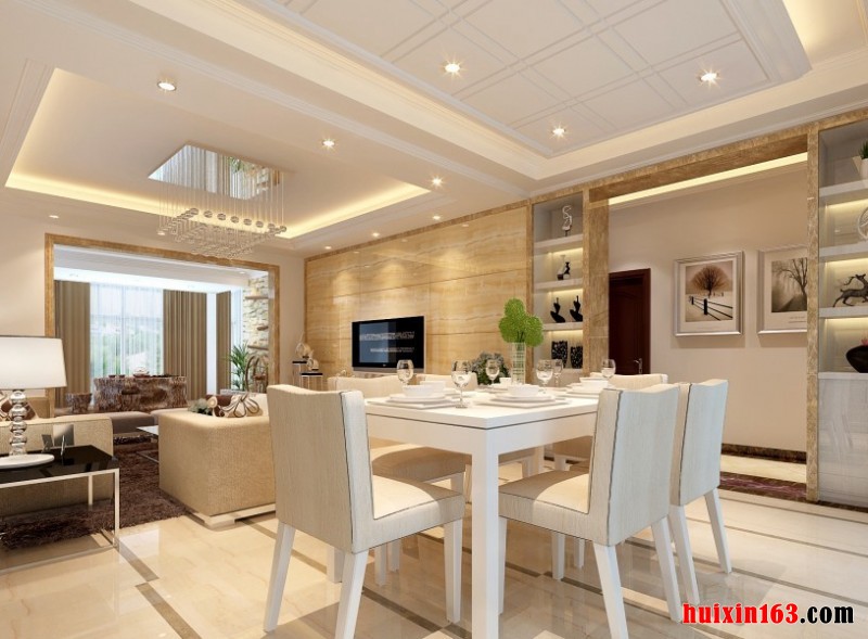 凹位造型石膏客厅吊顶,简约且富有层次感,水晶珠帘吸顶灯安装在客厅吊顶中央,为吊顶增色不少,暖色调灯带搭配,给人舒适简洁之感。黄色花纹墙砖贴饰而成的电视背景墙,简约中透着贵气,白色简约电视柜搭配,黑色线条勾勒出了电视柜的轮廓,让电视柜更显立体。地面上拼花地板设计,简洁的颜色,干净整洁。深色长毛地毯,与地面形成鲜明对比,起到了过渡的作用,白色简约方形茶几搭配,造型简单,金属结构框架让茶几更显时尚现代。洁净的白色,一尘不染,纯洁美感且实用性强。浅米黄的简约布艺沙发,纯色靠包及花纹靠枕装饰,深浅搭配,可以寻得视觉的平衡感。条纹沙发背景墙设计,黄白相间,金色铝板条增加了背景墙华贵之感,在灯光照射下,金光闪闪,异常华美。开放式的空间结构设计,大大增加了餐厅面积,造型简约的白色餐桌椅,灰色线条修饰,将餐桌椅的立体感表现了出来,小巧可爱的瓶插植物装饰,整体看上去清新自然。