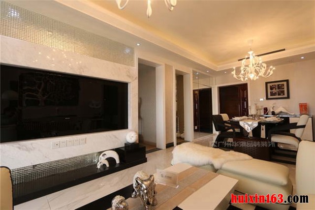 白色花纹石板结合玻璃类材料打造的电视背景墙,时尚华贵。玻璃具有较好的折射性与反光性,可营造出动态的光感效果,在阳光的照射下,可使家居色彩斑斓、光彩照人,甚是美丽。凹位造型吊顶设计,一直延伸到餐厅,整面吊顶,看上去简洁大方、视觉舒适度高。造型优美的吊灯悬挂在客厅吊顶中央,散发着夺目的耀眼光芒,映得家居格外明亮。白色花纹地砖铺地,黑色地台式电视柜搭配,鲜明的对比,突显出了电视柜的立体感,时尚美观。米色简约皮质沙发,简单的黑色线条将沙发的轮廓勾勒了出来,增加了沙发的立体感。黑白相间的条纹考办,白底黑花纹的碎花靠枕,看上去是那样和谐自然、简洁舒适。颇具艺术感的立体组合装饰画挂在沙发背景墙上,深邃的黑色与高贵的银色先搭配,在浅色背景墙上显得格外显眼,点缀了墙面,装饰了家居,也带来了浓郁的艺术气息。