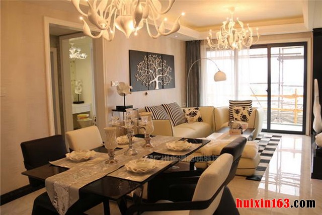 白色花纹石板结合玻璃类材料打造的电视背景墙,时尚华贵。玻璃具有较好的折射性与反光性,可营造出动态的光感效果,在阳光的照射下,可使家居色彩斑斓、光彩照人,甚是美丽。凹位造型吊顶设计,一直延伸到餐厅,整面吊顶,看上去简洁大方、视觉舒适度高。造型优美的吊灯悬挂在客厅吊顶中央,散发着夺目的耀眼光芒,映得家居格外明亮。白色花纹地砖铺地,黑色地台式电视柜搭配,鲜明的对比,突显出了电视柜的立体感,时尚美观。米色简约皮质沙发,简单的黑色线条将沙发的轮廓勾勒了出来,增加了沙发的立体感。黑白相间的条纹考办,白底黑花纹的碎花靠枕,看上去是那样和谐自然、简洁舒适。颇具艺术感的立体组合装饰画挂在沙发背景墙上,深邃的黑色与高贵的银色先搭配,在浅色背景墙上显得格外显眼,点缀了墙面,装饰了家居,也带来了浓郁的艺术气息。