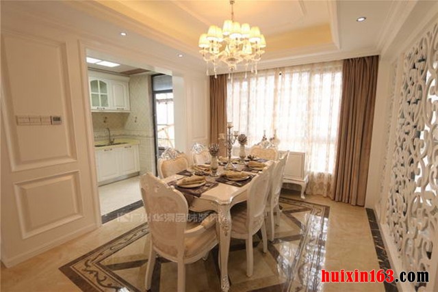 半开放式的厨房设计,开放式的餐厅空间设计,增加了餐厅与厨房的面积,也让家居显得宽敞明亮不拘束。白色木质结构沙发,银色雕花配饰装饰,提升了家居格调,也增加了家居品味。精致的餐具,精美的烛台,无一不体现着欧美风情的浪漫与典雅,以白色为主的家居色调,也在一定程度上增加了家居空间,营造出了开敞通透、温馨浪漫的生活环境。