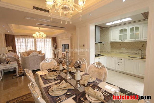 半开放式的厨房设计,开放式的餐厅空间设计,增加了餐厅与厨房的面积,也让家居显得宽敞明亮不拘束。白色木质结构沙发,银色雕花配饰装饰,提升了家居格调,也增加了家居品味。精致的餐具,精美的烛台,无一不体现着欧美风情的浪漫与典雅,以白色为主的家居色调,也在一定程度上增加了家居空间,营造出了开敞通透、温馨浪漫的生活环境。