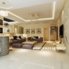 凹位吊顶,水晶珠帘吸顶灯点缀,光线柔和的灯带装饰,看山去简洁舒适且不乏华贵之感。浅色花纹墙纸铺贴而成的电视背景墙,玻璃镜条交织装饰,线条简单,造型随意,给人简洁自然,自在无拘束的轻松感,时尚个性。画完呢地板砖铺地,淡淡的颜色,总能带来干净整洁的感觉,美缝剂勾缝,防水防渗透,即使时间再长,也不会变黑而影响地面的整体美观。棕色边地毯过渡,清洗的界限明确了客厅中的重要位置。深色简约布艺沙发,黑色靠包及白色靠枕装饰,明暗搭配,深浅结合,符合视觉平衡感,也调和了家居氛围,因此,在以浅色调为主的家居中,适当深色点缀是很有必要的。