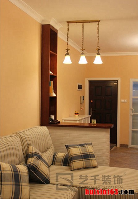 本案采用现代简约风格融入地中海风格元素设计手法来对家居进行装修设计,平面式石膏板吊顶设计,简单的白色石膏顶角线装饰,看上去简约大方。白色铁艺吊顶悬挂在客厅吊顶中央,散发着柔和的光线,米黄色墙漆粉饰,在灯光映射下,使得整个家居都倍感温馨。家居整体空间并不是十分大,为了能使小空间不给人拘束不自在的不适感,本案采用开放式的空间结构设计,让客厅与餐厅隔过道而邻,隔断墙吧台一体式设计,巧妙的将客厅与门厅划分开,沙比利木桌面与木柜结合白色仿砖墙壁纸贴饰而成的墙面,看上纯朴自然,铁艺吊灯悬挂在吧台上方,做旧的铜色与整体搭配的恰当好处,古雅的美感油然而生。蓝白相间的格子布艺沙发,裙边设计,优雅优美,条纹靠包及坐垫搭配,格子靠枕装饰,是地中海风格特点的体现,看着就给人柔软舒适的感觉。仿古砖铺地,质地亚光,即可避免光污染,也与家居的整体设计风格相符,具有古典的独特韵味,常常运用在地中海风格的家居设计中,用以体现出大自然泥土般的自然颜色。垭口电视背景墙设计,浅色花纹墙纸装饰,半穿凿马蹄窗设计,立体感强,白色简约木质烤漆茶几搭配,整体感觉清新淡雅且实用性强。