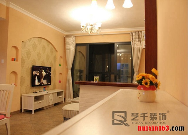 本案采用现代简约风格融入地中海风格元素设计手法来对家居进行装修设计,平面式石膏板吊顶设计,简单的白色石膏顶角线装饰,看上去简约大方。白色铁艺吊顶悬挂在客厅吊顶中央,散发着柔和的光线,米黄色墙漆粉饰,在灯光映射下,使得整个家居都倍感温馨。家居整体空间并不是十分大,为了能使小空间不给人拘束不自在的不适感,本案采用开放式的空间结构设计,让客厅与餐厅隔过道而邻,隔断墙吧台一体式设计,巧妙的将客厅与门厅划分开,沙比利木桌面与木柜结合白色仿砖墙壁纸贴饰而成的墙面,看上纯朴自然,铁艺吊灯悬挂在吧台上方,做旧的铜色与整体搭配的恰当好处,古雅的美感油然而生。蓝白相间的格子布艺沙发,裙边设计,优雅优美,条纹靠包及坐垫搭配,格子靠枕装饰,是地中海风格特点的体现,看着就给人柔软舒适的感觉。仿古砖铺地,质地亚光,即可避免光污染,也与家居的整体设计风格相符,具有古典的独特韵味,常常运用在地中海风格的家居设计中,用以体现出大自然泥土般的自然颜色。垭口电视背景墙设计,浅色花纹墙纸装饰,半穿凿马蹄窗设计,立体感强,白色简约木质烤漆茶几搭配,整体感觉清新淡雅且实用性强。