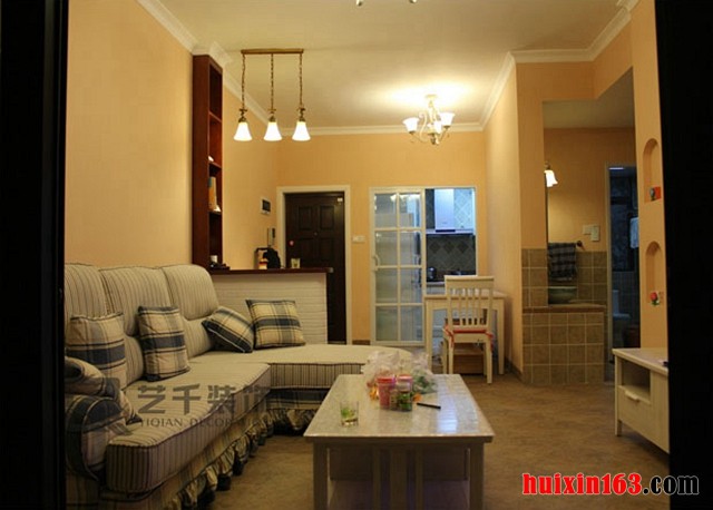 本案采用现代简约风格融入地中海风格元素设计手法来对家居进行装修设计,平面式石膏板吊顶设计,简单的白色石膏顶角线装饰,看上去简约大方。白色铁艺吊顶悬挂在客厅吊顶中央,散发着柔和的光线,米黄色墙漆粉饰,在灯光映射下,使得整个家居都倍感温馨。家居整体空间并不是十分大,为了能使小空间不给人拘束不自在的不适感,本案采用开放式的空间结构设计,让客厅与餐厅隔过道而邻,隔断墙吧台一体式设计,巧妙的将客厅与门厅划分开,沙比利木桌面与木柜结合白色仿砖墙壁纸贴饰而成的墙面,看上纯朴自然,铁艺吊灯悬挂在吧台上方,做旧的铜色与整体搭配的恰当好处,古雅的美感油然而生。蓝白相间的格子布艺沙发,裙边设计,优雅优美,条纹靠包及坐垫搭配,格子靠枕装饰,是地中海风格特点的体现,看着就给人柔软舒适的感觉。仿古砖铺地,质地亚光,即可避免光污染,也与家居的整体设计风格相符,具有古典的独特韵味,常常运用在地中海风格的家居设计中,用以体现出大自然泥土般的自然颜色。垭口电视背景墙设计,浅色花纹墙纸装饰,半穿凿马蹄窗设计,立体感强,白色简约木质烤漆茶几搭配,整体感觉清新淡雅且实用性强。