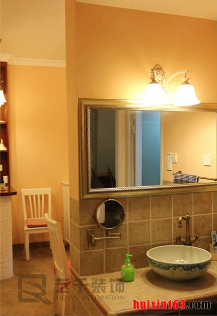 本案采用现代简约风格融入地中海风格元素设计手法来对家居进行装修设计,平面式石膏板吊顶设计,简单的白色石膏顶角线装饰,看上去简约大方。白色铁艺吊顶悬挂在客厅吊顶中央,散发着柔和的光线,米黄色墙漆粉饰,在灯光映射下,使得整个家居都倍感温馨。家居整体空间并不是十分大,为了能使小空间不给人拘束不自在的不适感,本案采用开放式的空间结构设计,让客厅与餐厅隔过道而邻,隔断墙吧台一体式设计,巧妙的将客厅与门厅划分开,沙比利木桌面与木柜结合白色仿砖墙壁纸贴饰而成的墙面,看上纯朴自然,铁艺吊灯悬挂在吧台上方,做旧的铜色与整体搭配的恰当好处,古雅的美感油然而生。蓝白相间的格子布艺沙发,裙边设计,优雅优美,条纹靠包及坐垫搭配,格子靠枕装饰,是地中海风格特点的体现,看着就给人柔软舒适的感觉。仿古砖铺地,质地亚光,即可避免光污染,也与家居的整体设计风格相符,具有古典的独特韵味,常常运用在地中海风格的家居设计中,用以体现出大自然泥土般的自然颜色。垭口电视背景墙设计,浅色花纹墙纸装饰,半穿凿马蹄窗设计,立体感强,白色简约木质烤漆茶几搭配,整体感觉清新淡雅且实用性强。