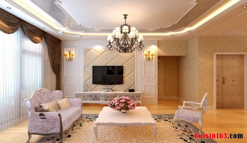 实木复合地板铺设地面,本案采用的色泽较浅的桦木实木复合地板,质地自然淡雅、脚感舒适,与暖黄色灯光搭配,可营造温馨舒适的家居氛围。精美花纹地毯,花样复杂多姿,灰色底色,与地面形成鲜明对比,起到了过渡的作用。白色简约烤漆木质茶几,质地纯洁,加之弧度曲线桌腿设计,给人以优雅之感。软包电视背景墙设计,石膏线框装饰,让电视背景墙更显立体,做工细致,造型优美的银色电视柜搭配,整体感觉,端庄沉稳、典雅高贵。浅色花纹墙纸铺贴着沙发背景墙,以深色挂画装饰背景墙,平衡色彩的同时也让整体看上去更显和谐,而且,在以浅色为大背景墙的情况下,深色壁画装饰更符合设计审美,既能将装饰画的美丽体现出来,也不会让背景墙显得过于单调。淡紫色花纹软包布艺沙发,看着舒适柔软的感觉,浅金色烤漆木结构框架,椅背顶梁优雅的造型设计,整体感觉端庄典雅,而淡淡的紫色,总能散发出浪漫气息,增加室内美感。吊顶设计优美大气,银色墙纸装饰,增添了华贵之感,大铁艺吊灯悬挂在其中央,华美雅致,流露着非凡气质。灯带及射灯的搭配,增加室内明度,提升设备光感度,也起到了点缀吊顶的作用。