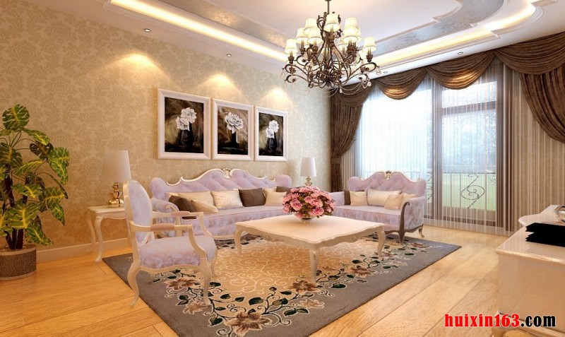 实木复合地板铺设地面,本案采用的色泽较浅的桦木实木复合地板,质地自然淡雅、脚感舒适,与暖黄色灯光搭配,可营造温馨舒适的家居氛围。精美花纹地毯,花样复杂多姿,灰色底色,与地面形成鲜明对比,起到了过渡的作用。白色简约烤漆木质茶几,质地纯洁,加之弧度曲线桌腿设计,给人以优雅之感。软包电视背景墙设计,石膏线框装饰,让电视背景墙更显立体,做工细致,造型优美的银色电视柜搭配,整体感觉,端庄沉稳、典雅高贵。浅色花纹墙纸铺贴着沙发背景墙,以深色挂画装饰背景墙,平衡色彩的同时也让整体看上去更显和谐,而且,在以浅色为大背景墙的情况下,深色壁画装饰更符合设计审美,既能将装饰画的美丽体现出来,也不会让背景墙显得过于单调。淡紫色花纹软包布艺沙发,看着舒适柔软的感觉,浅金色烤漆木结构框架,椅背顶梁优雅的造型设计,整体感觉端庄典雅,而淡淡的紫色,总能散发出浪漫气息,增加室内美感。吊顶设计优美大气,银色墙纸装饰,增添了华贵之感,大铁艺吊灯悬挂在其中央,华美雅致,流露着非凡气质。灯带及射灯的搭配,增加室内明度,提升设备光感度,也起到了点缀吊顶的作用。