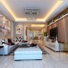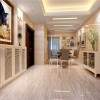 凹位造型石膏板吊顶,周边简单修饰,简约大方且层次感强。水晶珠帘吸顶灯安装在客厅吊顶中央,镂空雕花灯罩让吸顶灯更显优雅华美,暖黄色灯带四周装饰,不仅可以吸顶灯搭配营造出了璀璨明亮且富有变化的灯光效果,而且,柔和的光线也给家居蒙上了一层温馨浪漫的艺术色彩。光面花纹浅色墙砖贴饰而成的沙发背景墙,组合装饰画装饰,明艳丰富的色彩,时尚个性,极富艺术美感。白色简约软包皮质转角沙发,纯洁的白色,总能给人一尘不染的整洁感,看着舒心干净。奶牛纹靠枕及深色花纹靠枕装饰,适当点缀,深浅结合,明暗搭配,可以很容易让人找到平衡点,也调和了家居的艺术氛围,有明有暗、有深有浅,更显和谐自然。仿木纹地板砖铺地,解决了木地板带来的麻烦,却不失自然的清新与淡雅。深色方块格子地毯过渡,黑色方形茶几搭配,与沙发及坐墩搭配,强烈的反差,更加突出了茶几的立体感,适当花纹装饰,让茶几增添了优雅的感觉。