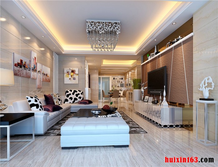 凹位造型石膏板吊顶,周边简单修饰,简约大方且层次感强。水晶珠帘吸顶灯安装在客厅吊顶中央,镂空雕花灯罩让吸顶灯更显优雅华美,暖黄色灯带四周装饰,不仅可以吸顶灯搭配营造出了璀璨明亮且富有变化的灯光效果,而且,柔和的光线也给家居蒙上了一层温馨浪漫的艺术色彩。光面花纹浅色墙砖贴饰而成的沙发背景墙,组合装饰画装饰,明艳丰富的色彩,时尚个性,极富艺术美感。白色简约软包皮质转角沙发,纯洁的白色,总能给人一尘不染的整洁感,看着舒心干净。奶牛纹靠枕及深色花纹靠枕装饰,适当点缀,深浅结合,明暗搭配,可以很容易让人找到平衡点,也调和了家居的艺术氛围,有明有暗、有深有浅,更显和谐自然。仿木纹地板砖铺地,解决了木地板带来的麻烦,却不失自然的清新与淡雅。深色方块格子地毯过渡,黑色方形茶几搭配,与沙发及坐墩搭配,强烈的反差,更加突出了茶几的立体感,适当花纹装饰,让茶几增添了优雅的感觉。