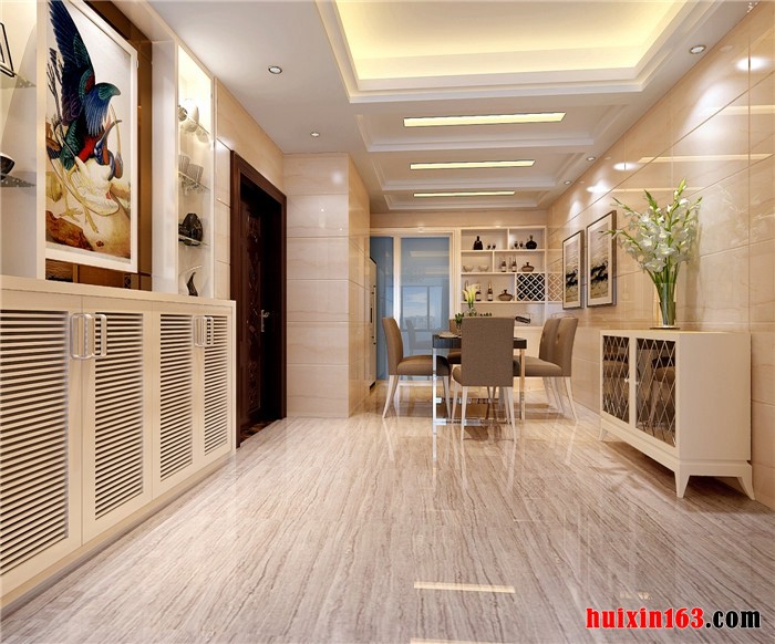 凹位造型石膏板吊顶,周边简单修饰,简约大方且层次感强。水晶珠帘吸顶灯安装在客厅吊顶中央,镂空雕花灯罩让吸顶灯更显优雅华美,暖黄色灯带四周装饰,不仅可以吸顶灯搭配营造出了璀璨明亮且富有变化的灯光效果,而且,柔和的光线也给家居蒙上了一层温馨浪漫的艺术色彩。光面花纹浅色墙砖贴饰而成的沙发背景墙,组合装饰画装饰,明艳丰富的色彩,时尚个性,极富艺术美感。白色简约软包皮质转角沙发,纯洁的白色,总能给人一尘不染的整洁感,看着舒心干净。奶牛纹靠枕及深色花纹靠枕装饰,适当点缀,深浅结合,明暗搭配,可以很容易让人找到平衡点,也调和了家居的艺术氛围,有明有暗、有深有浅,更显和谐自然。仿木纹地板砖铺地,解决了木地板带来的麻烦,却不失自然的清新与淡雅。深色方块格子地毯过渡,黑色方形茶几搭配,与沙发及坐墩搭配,强烈的反差,更加突出了茶几的立体感,适当花纹装饰,让茶几增添了优雅的感觉。