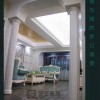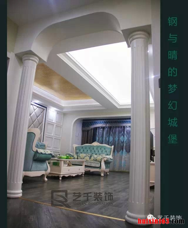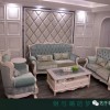 菱形格子软包沙发背景墙,高雅的灰色,镜条周围装饰,时尚稳重。整个墙面,堆成造型设计,两旁留白处,石膏线打造的方格子造型,立体感十足。粉绿色软包布艺经典欧式沙发,白色烤漆结构框架,起伏不平的椅背顶梁设计,结合精美的雕花,造型精致优雅,椅腿弧度曲线造型,辅以适当的雕花装饰,看上去端庄典雅,与家居整体设计大背景相和谐。石膏板吊顶,内凹造型设计增加了客厅的层次感。阳台处垭口设计,深蓝色窗帘,高贵大气,如客厅出的罗马柱装饰,提升了家居品味,营造出气派奢华之感。本案客厅内并没有设置主灯,以明亮的灯带搭配射灯装饰,设计简约实用,且十分明亮。黑胡桃木地板铺地,朴实自然的质地,深沉内敛的颜色,与吊顶及墙面形成鲜明对比,给人沉稳庄重之感。