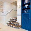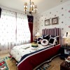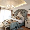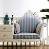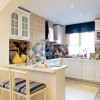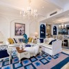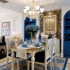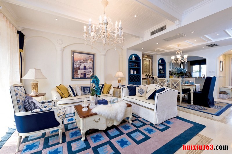 白色总能给人洁净明亮的感觉,室内多些白颜色,可以起到延伸视觉空间效果的目的。本案家居定位为地中海风格,除了纯洁的白色,蓝色自然少不了,蓝与白的搭配,是地中海风格的重要元素之一。木龙骨吊顶,白色刷涂,给人干净整洁之感,白色铁艺烤漆烛台式水晶灯悬吊与客厅吊顶上,零星射灯点缀,整体感觉华美优雅。罗马柱装饰沙发背景墙,顶部拱形设计,辅以圆形浮雕装饰,墙面中央意境唯美的地中海地区风景画装饰,画风真实自然,好似实景一般,细细欣赏,会情不自禁的感觉眼前不是一幅画,更像是一扇小窗,画中的美丽景致就在窗外,近在咫尺,感觉是那样的美好与惬意。白色布艺沙发,简单的黑色线条将沙发的大致轮廓勾勒了出来,将沙发的立体感突显了出来,颜色图案各异的靠枕双视,质地柔软的棉布,看着就给人舒适优柔的感觉。刷涂有白漆的木结构框架沙发椅,宝蓝色搭配,干净利落,蓝色花纹坐垫及靠背设计,蓝白相间的条纹靠枕装饰,沙发椅造型优雅,线条柔婉与顺直兼并,符合家居整体设计风格,也与茶几及沙发搭配的恰当和谐。仿古砖及地砖拼花地板设计,花纹方块地毯过渡,不同深浅的蓝色搭配,带个家居轻松与舒畅之感。