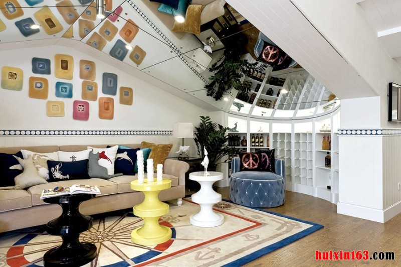 白色总能给人洁净明亮的感觉,室内多些白颜色,可以起到延伸视觉空间效果的目的。本案家居定位为地中海风格,除了纯洁的白色,蓝色自然少不了,蓝与白的搭配,是地中海风格的重要元素之一。木龙骨吊顶,白色刷涂,给人干净整洁之感,白色铁艺烤漆烛台式水晶灯悬吊与客厅吊顶上,零星射灯点缀,整体感觉华美优雅。罗马柱装饰沙发背景墙,顶部拱形设计,辅以圆形浮雕装饰,墙面中央意境唯美的地中海地区风景画装饰,画风真实自然,好似实景一般,细细欣赏,会情不自禁的感觉眼前不是一幅画,更像是一扇小窗,画中的美丽景致就在窗外,近在咫尺,感觉是那样的美好与惬意。白色布艺沙发,简单的黑色线条将沙发的大致轮廓勾勒了出来,将沙发的立体感突显了出来,颜色图案各异的靠枕双视,质地柔软的棉布,看着就给人舒适优柔的感觉。刷涂有白漆的木结构框架沙发椅,宝蓝色搭配,干净利落,蓝色花纹坐垫及靠背设计,蓝白相间的条纹靠枕装饰,沙发椅造型优雅,线条柔婉与顺直兼并,符合家居整体设计风格,也与茶几及沙发搭配的恰当和谐。仿古砖及地砖拼花地板设计,花纹方块地毯过渡,不同深浅的蓝色搭配,带个家居轻松与舒畅之感。