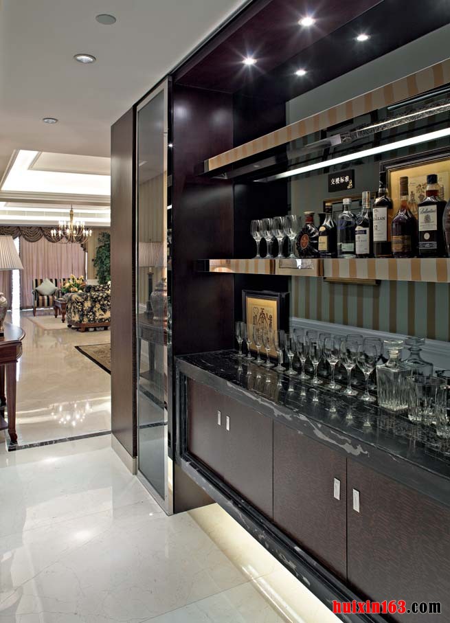就美式风格而言,宽大舒适是美式风格的特点,美国人喜欢有历史感的东西,正因如此,美式风格的家居要求不仅要能给人带来自在感与贵气感,历史感与文化感也是不可缺少的。而两种感觉,用质地自然地实木木材来表现是再合适不过的了。本案采用一体式胡桃木电视柜,既有电视柜的功能,又有置物柜的功能,同时带有背景墙,整体划一,古感立体,沉稳庄重且实用性很强。凹位造型吊顶设计,石膏线装饰,增加了客厅层次感。造型简约却不乏美感的烛台式铁艺烤漆吊顶悬挂在客厅吊顶中央,金色的灯身在明亮的灯光照射下金光闪闪,给人以华美富丽的感觉。石膏装饰工艺打造的电视背景墙,金色花边画框装裱的挂画置于沙发背景墙上,金色雕花饰品装饰墙面,两边各有一个铁艺墙壁灯搭配,整个沙发背景墙设计,造型对称,简洁优雅、艺术韵味浓厚。条纹印花布艺沙发,花纹、质地各异的靠枕装饰,看上去不仅柔软舒适,还给人高雅端庄之感。白色地砖铺地,干净整洁,一尘不染,精美绣花地毯过渡,胡桃木茶几,滚边设计,透明玻璃桌面,优雅的雕刻,充分体现出了美式家具的特点,保留古典家居的色泽与质感,透明玻璃的加入,又在古典中融入了现代元素,呈现出了多姿多彩的古典家具,古雅别致。