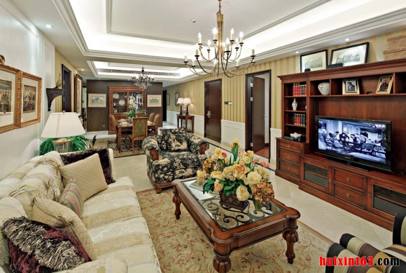 就美式风格而言,宽大舒适是美式风格的特点,美国人喜欢有历史感的东西,正因如此,美式风格的家居要求不仅要能给人带来自在感与贵气感,历史感与文化感也是不可缺少的。而两种感觉,用质地自然地实木木材来表现是再合适不过的了。本案采用一体式胡桃木电视柜,既有电视柜的功能,又有置物柜的功能,同时带有背景墙,整体划一,古感立体,沉稳庄重且实用性很强。凹位造型吊顶设计,石膏线装饰,增加了客厅层次感。造型简约却不乏美感的烛台式铁艺烤漆吊顶悬挂在客厅吊顶中央,金色的灯身在明亮的灯光照射下金光闪闪,给人以华美富丽的感觉。石膏装饰工艺打造的电视背景墙,金色花边画框装裱的挂画置于沙发背景墙上,金色雕花饰品装饰墙面,两边各有一个铁艺墙壁灯搭配,整个沙发背景墙设计,造型对称,简洁优雅、艺术韵味浓厚。条纹印花布艺沙发,花纹、质地各异的靠枕装饰,看上去不仅柔软舒适,还给人高雅端庄之感。白色地砖铺地,干净整洁,一尘不染,精美绣花地毯过渡,胡桃木茶几,滚边设计,透明玻璃桌面,优雅的雕刻,充分体现出了美式家具的特点,保留古典家居的色泽与质感,透明玻璃的加入,又在古典中融入了现代元素,呈现出了多姿多彩的古典家具,古雅别致。