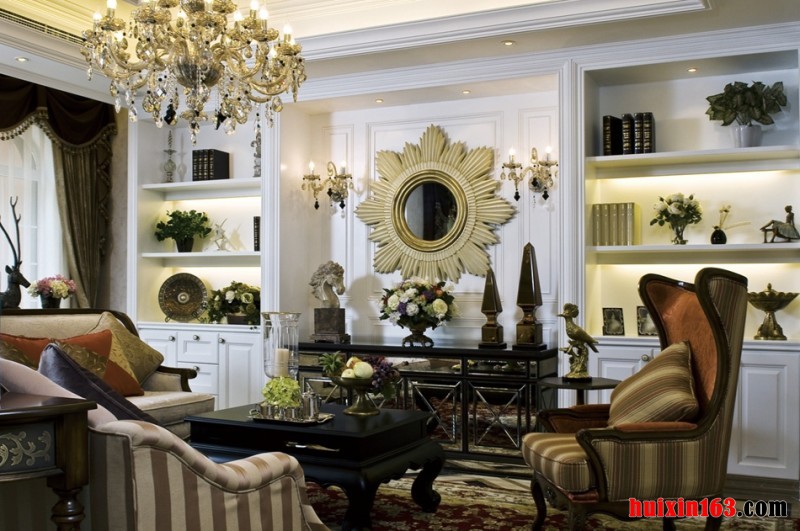 大气里的客厅吊顶设计,石膏线框装饰,极富层次感与立体感,华美的烛台式水晶灯悬挂在客厅吊顶中央,金色的灯身在灯光的照射下,流光溢彩,璀璨夺目,熠熠生辉。镜子的巧妙运用,增加了室内的空间,加之大大的落地窗设计,让整个客厅显得宽敞明亮。石膏装饰工艺设计的墙面,洁白的颜色,给人以延伸般的感觉,也有增加室内空间的作用,太阳般造型的镜子装饰墙面双头水晶墙壁灯搭配,既与吊灯相互呼应,也营造出高贵绮丽的美感。两旁造型简约的置物柜设计,整个墙面设计造型对称,设计手法自然简约、辅以写合适的饰品装饰,华贵之感油然而生。大理石拼花地板,精美提花地毯过渡,黑色木茶几搭配,弧度曲线桌腿设计,整体感觉高贵且优雅。沙比利木结构框架白色印花布艺沙发,浅咖色花纹靠枕装饰,整体感觉、端庄典雅、气质不凡。