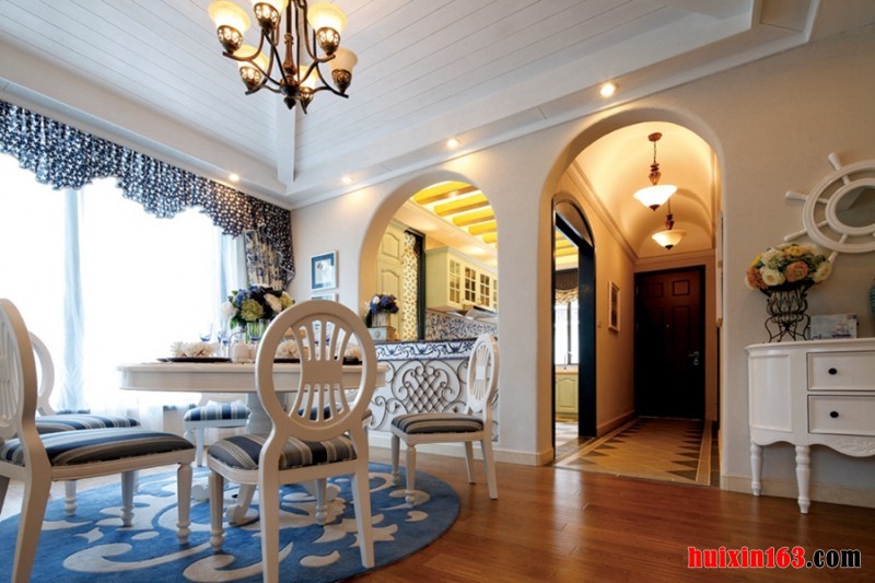 阶梯设计,将客厅与其他区域巧妙的分隔开,层次感十足。波打线的运用,大大增加了地面艺术感,使客厅地面更富变化与美感。开放式的空间结构设计,可以在最大程度上突出地中海风格的大气与宽广,展现地中海风格自由奔放,追求休闲自由的特点。拱形门与马蹄窗是地中海风格中不可缺少的元素,不仅体现出了曲线与直线完美结构后所产生的艺术美感,也能给人延伸般的透视感。地中海的美,包括海与天的美丽景致,而蓝色与白色正好可以很恰当的将海与天的特点展现出来,结合其他直逼自然的柔和色彩,相互交织,相互搭配,不仅造就了能给人浪漫唯美且温馨舒适的感觉,也是地中海民族文化的彰显与古老文明气息的流露。