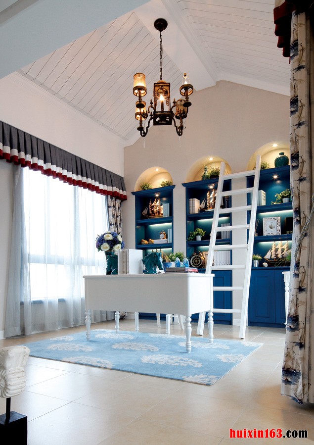 阶梯设计,将客厅与其他区域巧妙的分隔开,层次感十足。波打线的运用,大大增加了地面艺术感,使客厅地面更富变化与美感。开放式的空间结构设计,可以在最大程度上突出地中海风格的大气与宽广,展现地中海风格自由奔放,追求休闲自由的特点。拱形门与马蹄窗是地中海风格中不可缺少的元素,不仅体现出了曲线与直线完美结构后所产生的艺术美感,也能给人延伸般的透视感。地中海的美,包括海与天的美丽景致,而蓝色与白色正好可以很恰当的将海与天的特点展现出来,结合其他直逼自然的柔和色彩,相互交织,相互搭配,不仅造就了能给人浪漫唯美且温馨舒适的感觉,也是地中海民族文化的彰显与古老文明气息的流露。