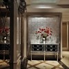 石膏板吊顶,菱形格子图案设计,石膏线装饰,简洁且富有立体感。水晶灯悬挂在客厅吊顶中央,晶莹剔透,甚是美丽。开敞宽阔的客厅空间,造型优雅,体态端庄的欧式沙发,实木结构框架,金色配饰装饰,金色的线条勾勒出了沙发轮廓,将沙发的品味与格调提升了上来,尽显高贵典雅。大理石拼花地板,深棕色毛地毯过渡,外形华美尽显线条勾边,适当雕花装饰,蓝色花纹流苏桌旗搭配,高雅贵气之感油然而生。开放式的空间设计,增加了餐厅面积,蓝色花纹餐椅,搭配银色穿着,华贵大气、端庄典雅。镜子打造的吊顶,拉高了餐厅的纵向空间,使得餐厅看上去面积增大了不少,当餐厅内的水晶灯点亮后,明亮柔和的光线在镜子的作用下,将光线通过折射或者反射发散出去,不让能造就富有变化的餐厅灯光效果,也会使餐厅显得格外亮堂,加之黄色欧式花纹墙纸装饰墙面,便会营造出温馨浪漫的就餐环境,设计合理巧妙,体现出了设计者的别出心裁。