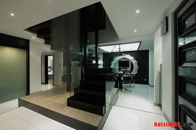 对于本案家居设计,在色彩的选择上主要以黑白两色为主,这样设计,看上去更显大气有内涵。白色电视背景墙,给人以延伸般的感觉,也很显干净纯洁,条纹造型设计,使得背景墙富有了立体感,不会显得平素无特点。白色地板砖铺地,奶牛花纹地毯铺地,黑色皮质沙发,木结构框架,与造型不规则的地毯搭配,更能显现出座椅本身。对于别墅户型而言,室内客厅的纵向的空间一般都会比普通住宅区高,造型简约的吊顶设计,充分利用空间优势,也使得客厅更显层次感,方形水晶珠帘吸顶灯置于吊顶上,外形简洁却美观,珠帘从上至下一直垂于茶几上方,较为宽大的造型,不仅是客厅的照明灯具,也起到了装饰室内的作用。柱体组合而成的白色沙发背景墙,设计简约立体且富有创意,白色本身的延伸感与镜子的完美结合,大大增加了室内空间面积,明亮的冷色光搭配,看上去极富高贵气质与现代时代气息。黑色软包皮质转角沙发,白色毛质坐垫适当搭配,明暗结合,鲜明的对比不仅突显出了沙发的立体感,也调和了室内的艺术氛围。透明玻璃桌面茶几,造型简单却很使用,与周遭搭配的恰当好处,整个客厅设计简约现代,宽敞明亮,时尚大气。